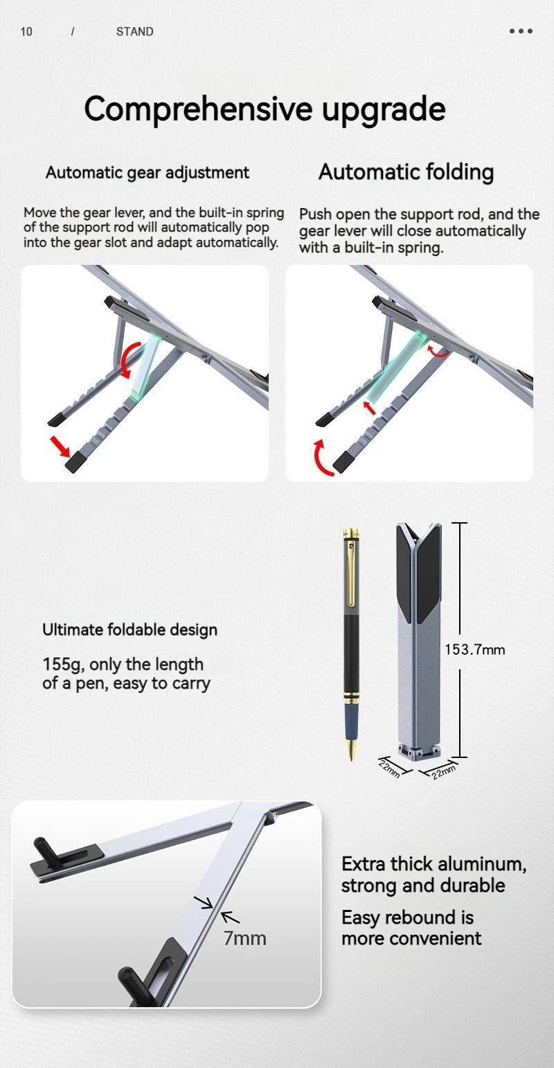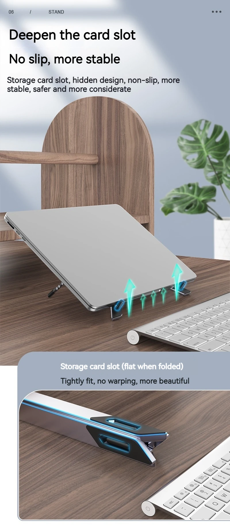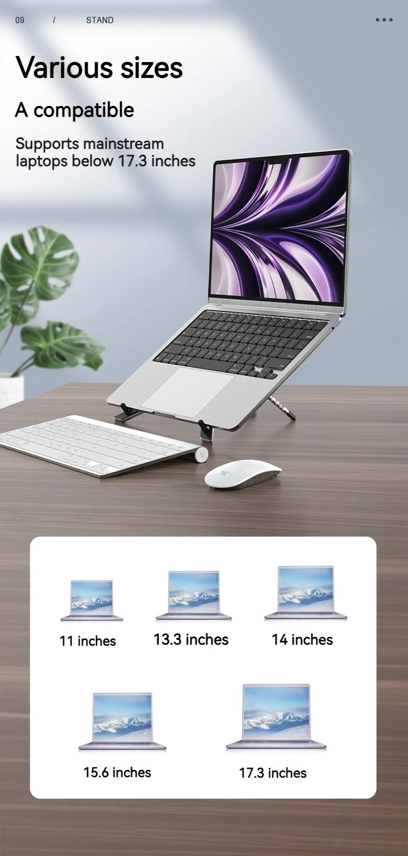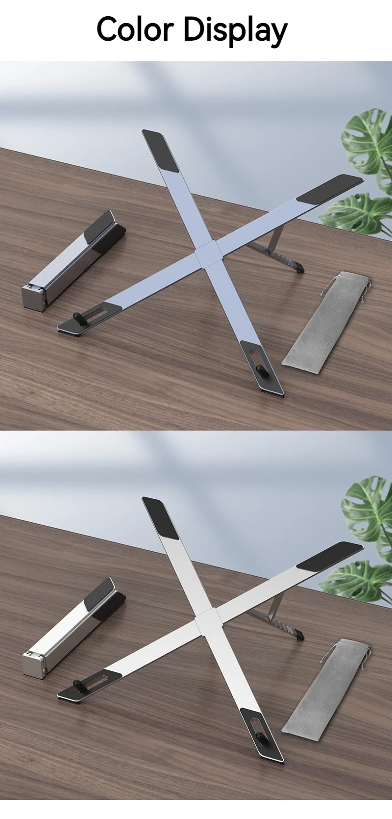 When folded, the laptop holder is compact and light weighted, it can be stored in the velvet sleeve that comes along.