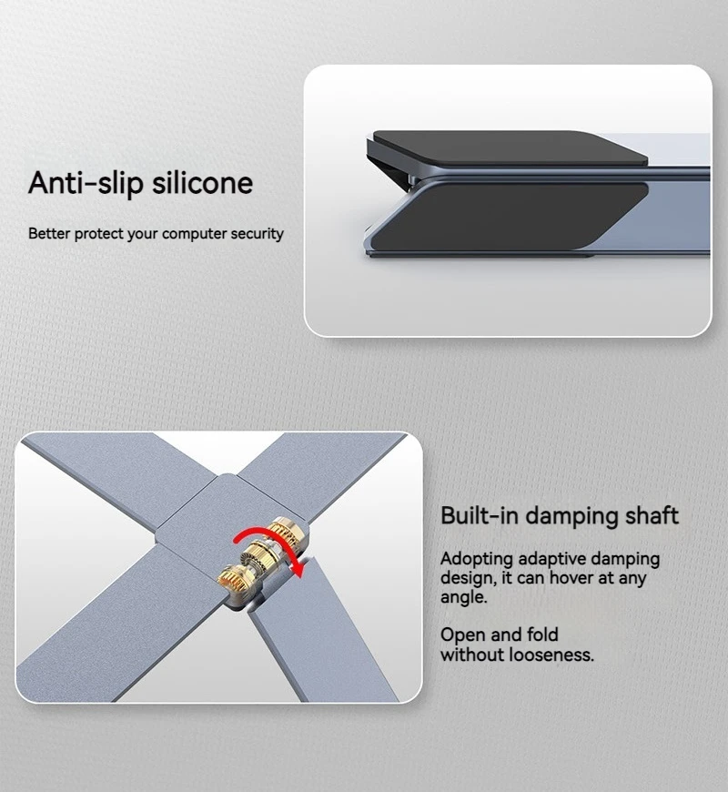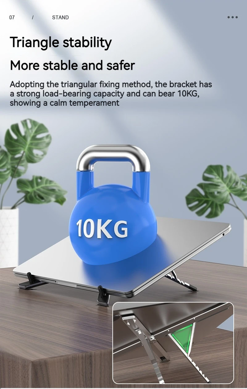This portable laptop stand is made of aluminum alloy with well polished surfaces and soft rubber pads, protecting your devices from scratches or slipping.